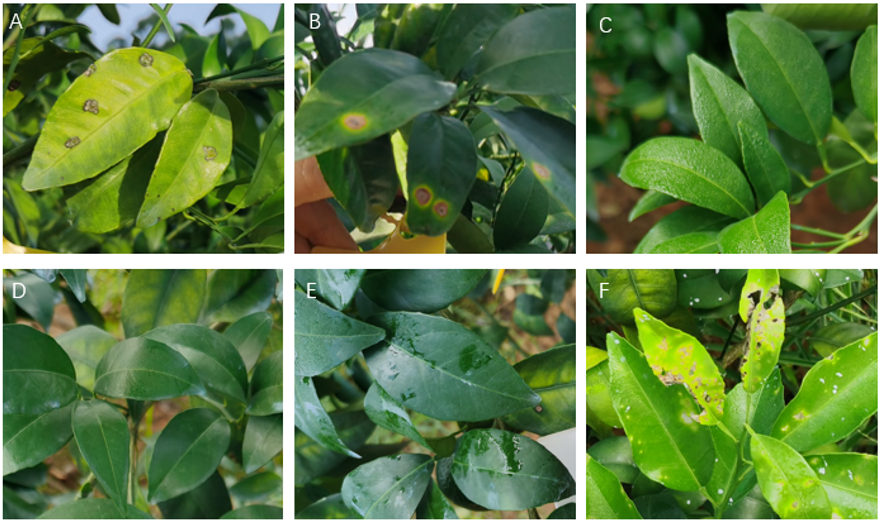 同時(shí),針對(duì)柑橘潰瘍病田間試驗(yàn)結(jié)果表明,兩次施藥后21天,對(duì)照藥劑2%春雷霉素稀釋500倍液平均防效為50.82%。2%春雷霉素稀釋600倍液+5%大蒜素稀釋1000倍液平均防效為76.80%。2%春雷霉素稀釋800倍液+5%大蒜素稀釋800倍液平均防效為81.96%。2%春雷霉素稀釋1000倍液+5%大蒜素稀釋600倍液平均防效為78.44%,減量增效效果顯著,2%春雷霉素減量超過(guò)30%,對(duì)病害防治效果提升20%以上。
