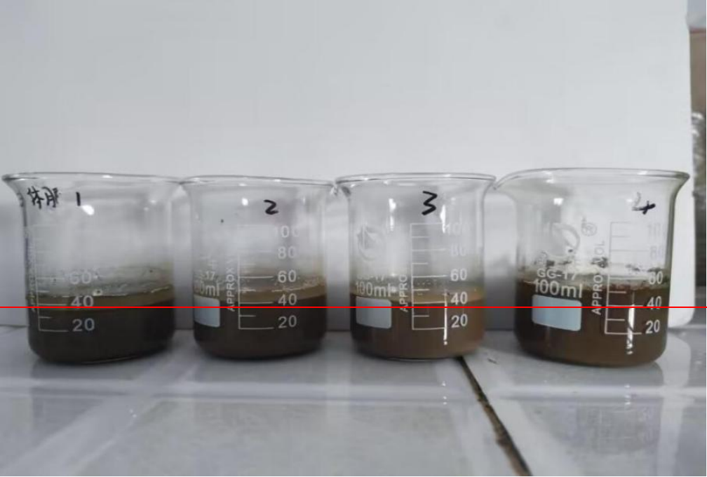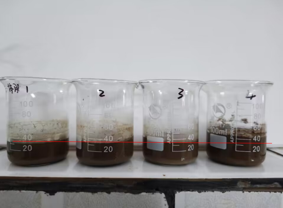 試驗方法:取相同板結(jié)地塊過0.5mm篩40g土樣4份加入4個100ml燒杯中,加水20ml,充分攪拌后靜置沉淀。